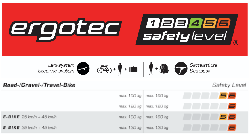 • Ergotec Safety Level 6 – Höchste Sicherheitsstufe, zugelassen für E-Bikes & S-Pedelecs bis 45 km/h
