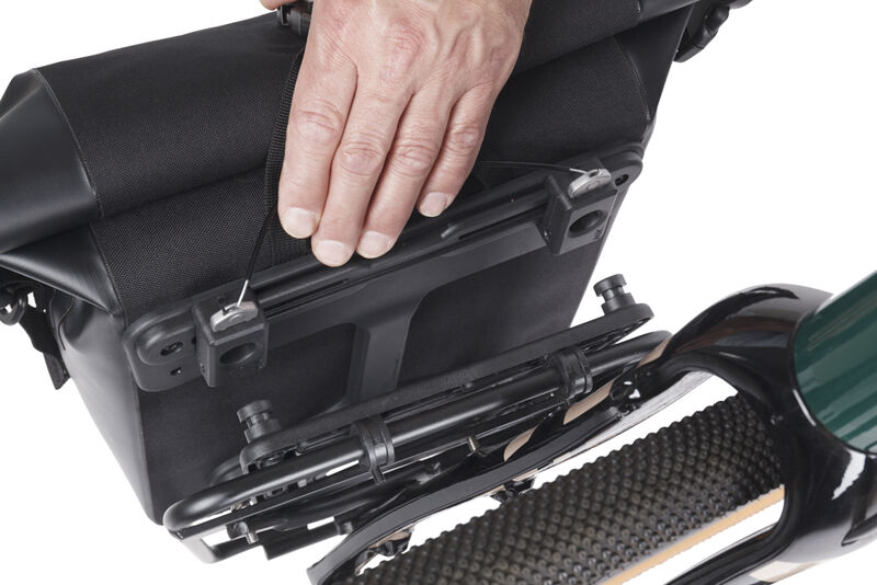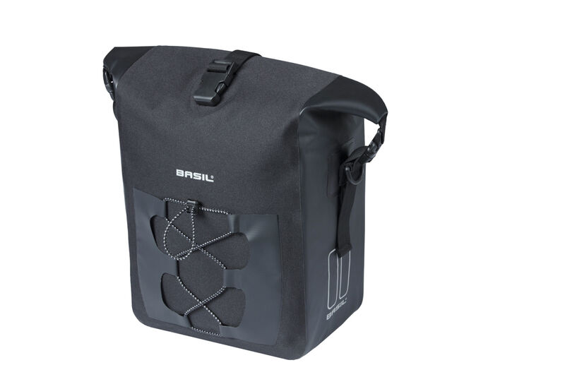 Die sportliche Basil Navigator Waterproof Packtasche ist zu 100% wasserdicht. An einem reflektierenden Gummiband finden nach der Fahrt der Helm oder eine nasse Regenjacke Platz. Die mit einem abnehmbaren Tragegurt ausgerüstete Tasche wird mit einem Rollverschluss geschlossen und mithilfe des Basil MIK Studs Systems einfach an den MIK-fähigen Gepäckträger deines Velos gehangen. Die MIK-Studs Aufnahme an der Rückseite der Tasche ist verfügt über eine deutlich flachere Bauweise im Vergleich zu Haken-Systemen und stören so nicht beim Tragen als Schultertasche.