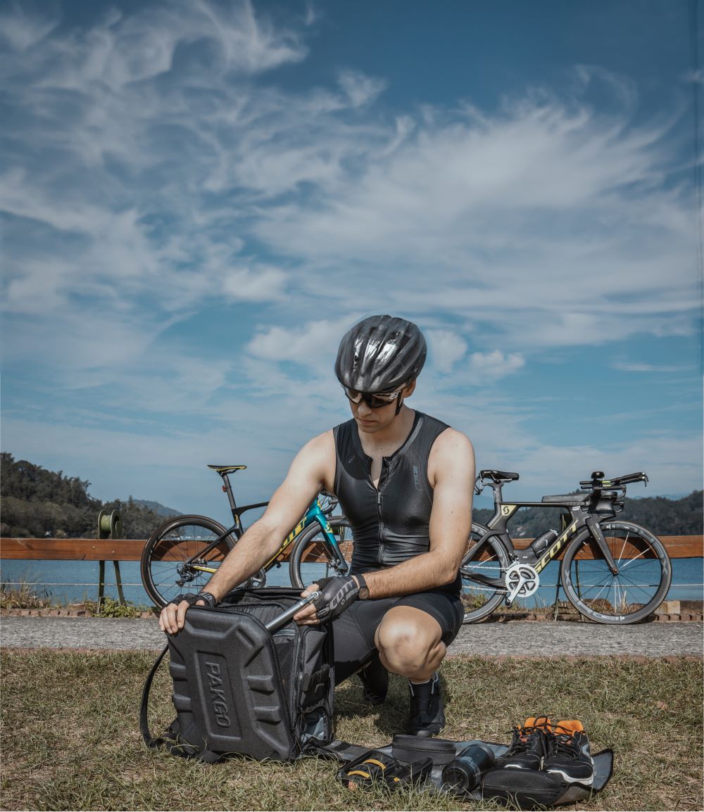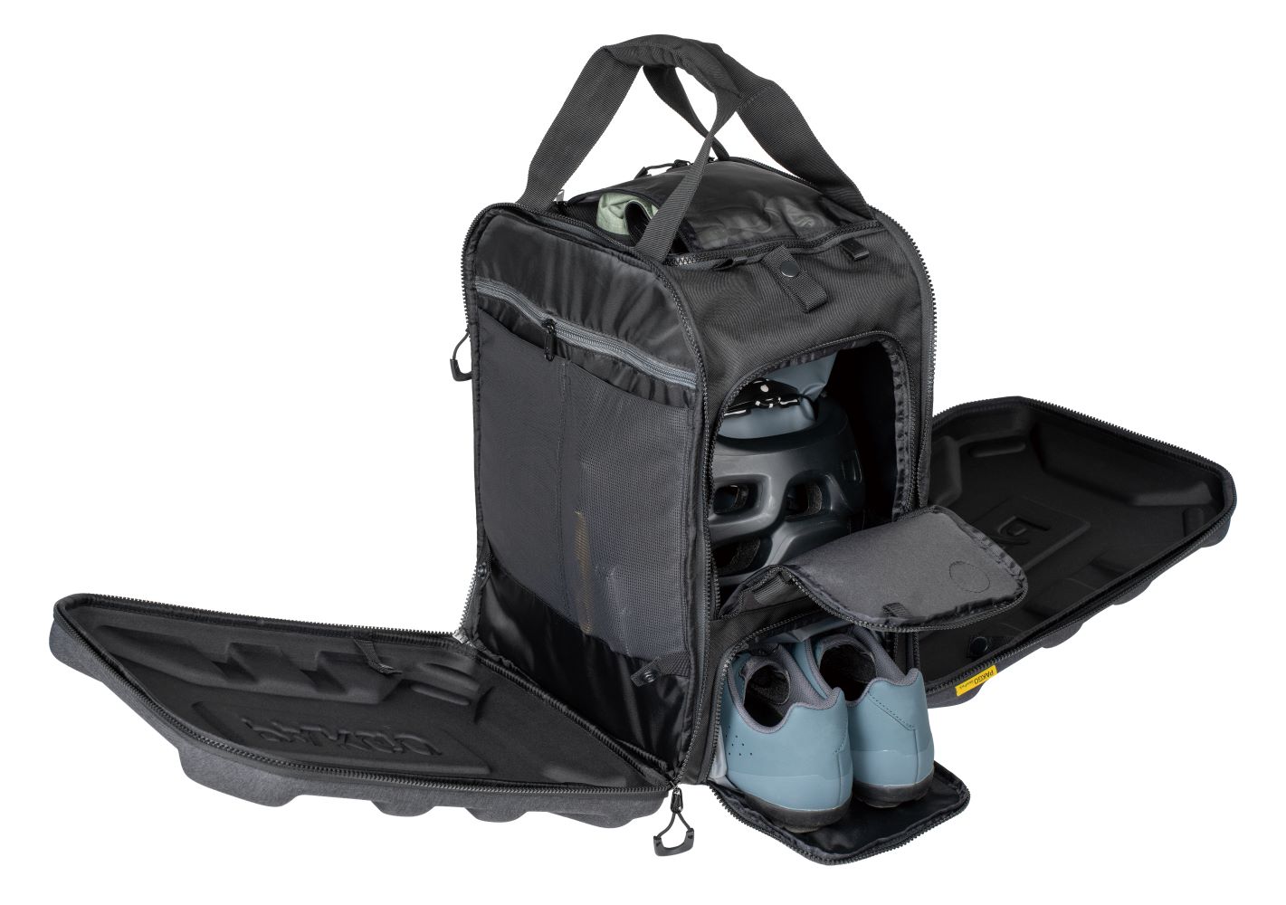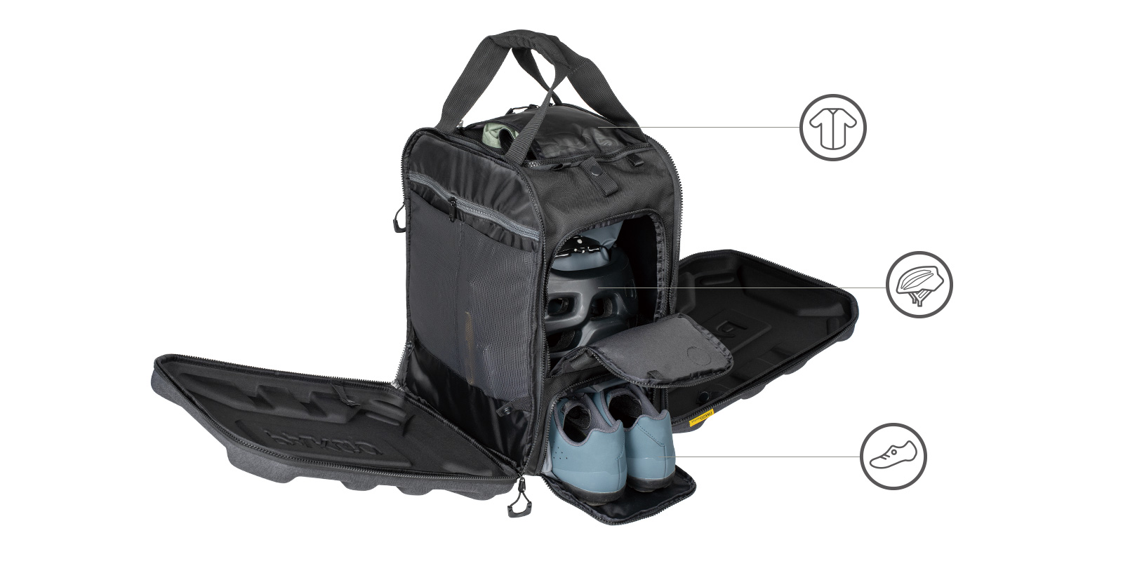 Mit drei separaten Hauptfächern und sechs Seitentaschen bietet die Tasche ausreichend Platz, um Helm, Rad- und Wechselkleidung, Trinkflaschen und weiteres Zubehör ordentlich zu verstauen. Alles bleibt griffbereit, organisiert und einsatzbereit für das nächste Abenteuer auf zwei Rädern, das Rennen oder den Triathlon.