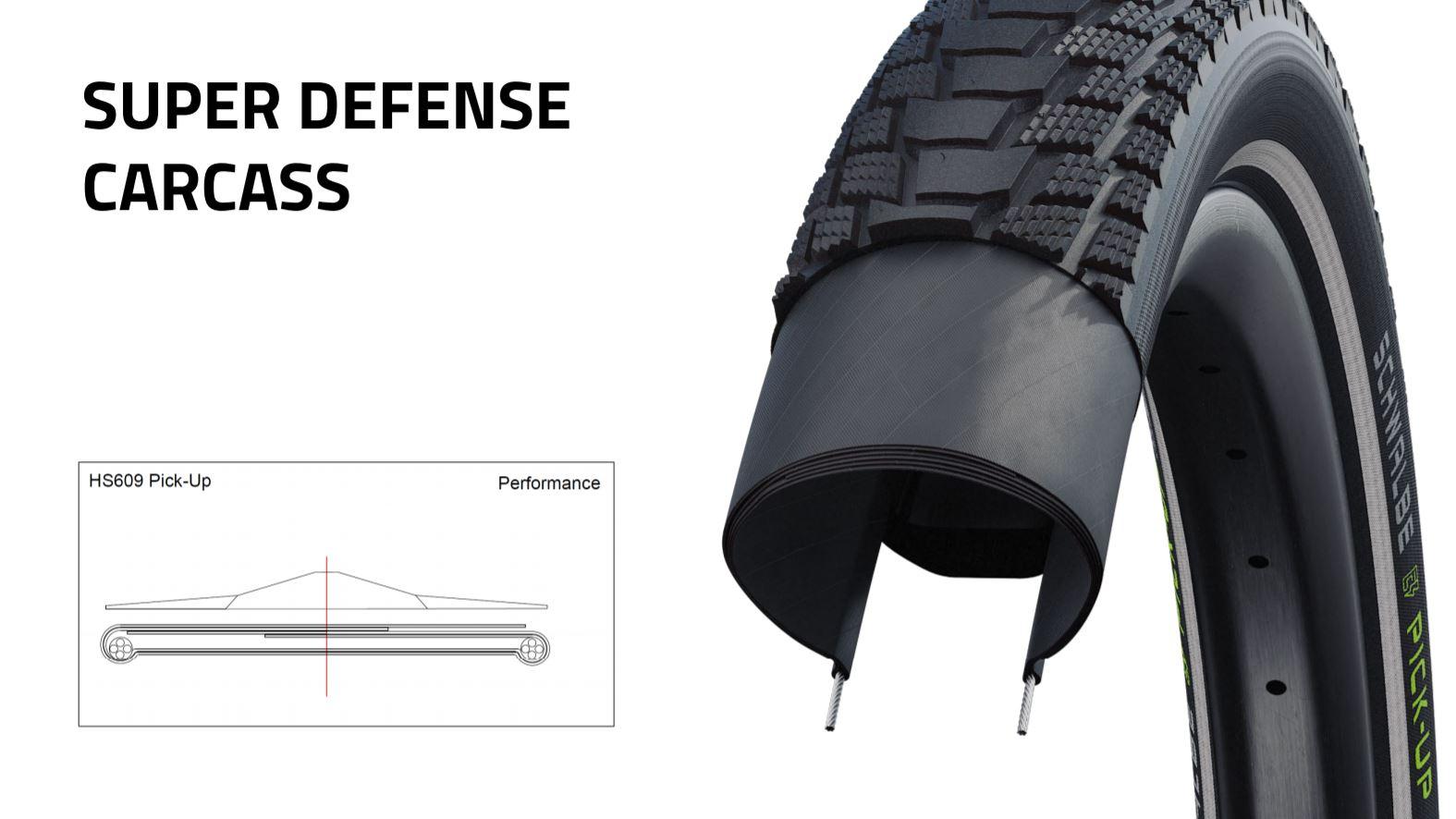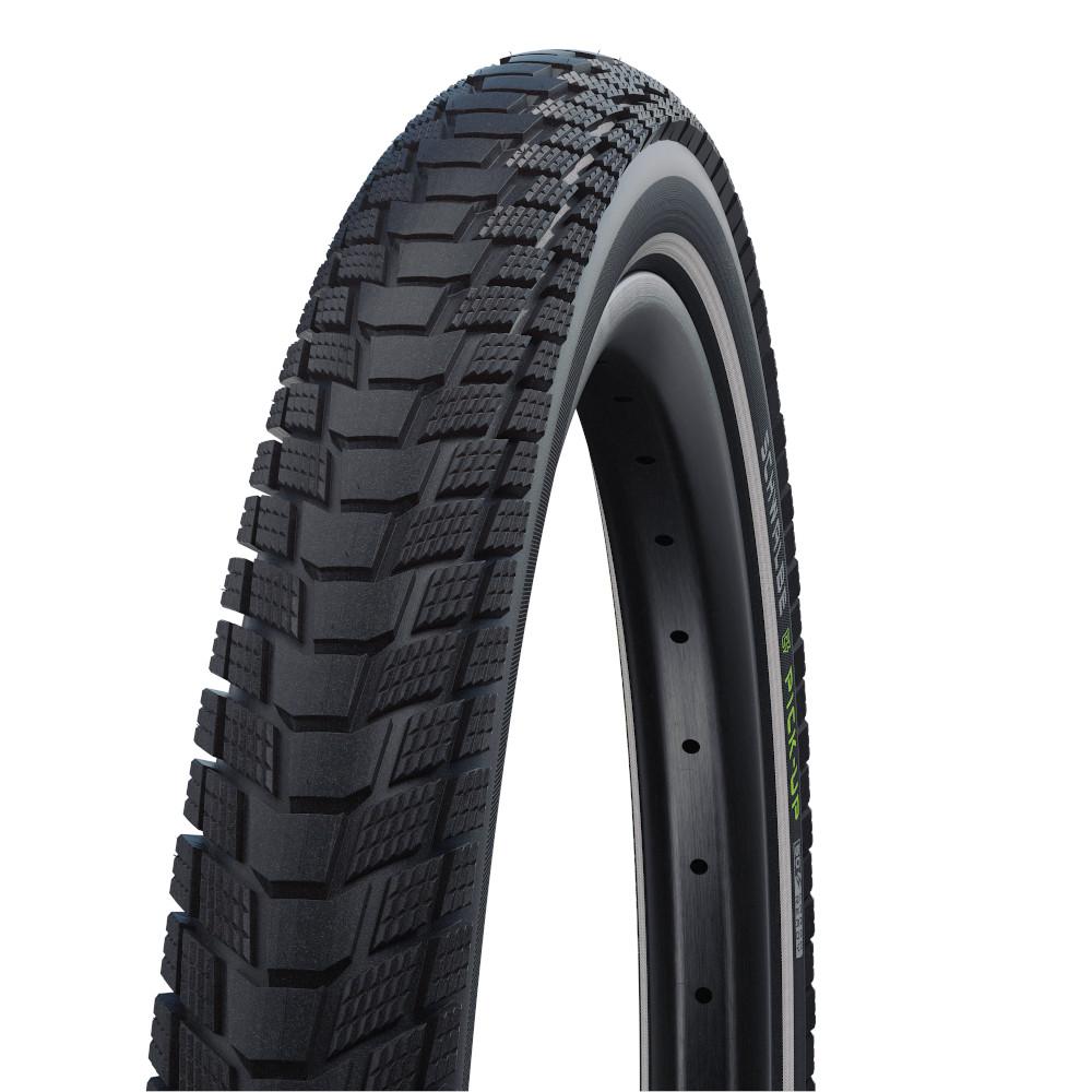 Der Schwalbe Pick-Up ist ein echter Cargo Reifen. Mit seiner extrem stabilen Doppelkarkasse ist der Pneu sehr belastbar. Mit maximaler Haltbarkeit, niedrigem Rollwiderstand und sehr gutem Grip ist der Schwalbe Addix E-Compound speziell für die hohen Belastungen am Cargo- und E-Bike optimiert. Für zuverlässigen Pannenschutz sorgt die äusserst stabile Doppelkarkasse Super Defense mit vielen Schichten Material.