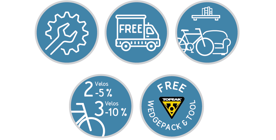 Beim Kauf von 2 Velos erhältst du 5% Rabatt auf beide Velos. Wenn du 3 Velos kaufst, sogar 10%.