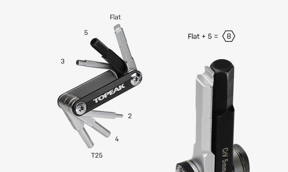 - Inbus: 2 / 3 / 4 / 5 / 8 mm (8 mm durch Kombination von 5 mm Inbus-Schlüssel und Flachkopf-Schraubendreher)