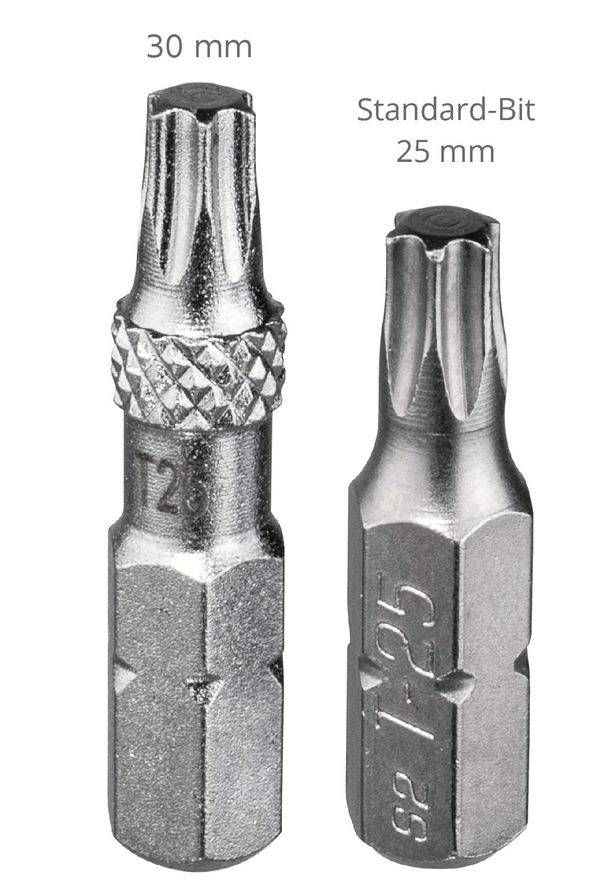 - Überlänge von 30 mm, erreicht auch versenkte Schrauben