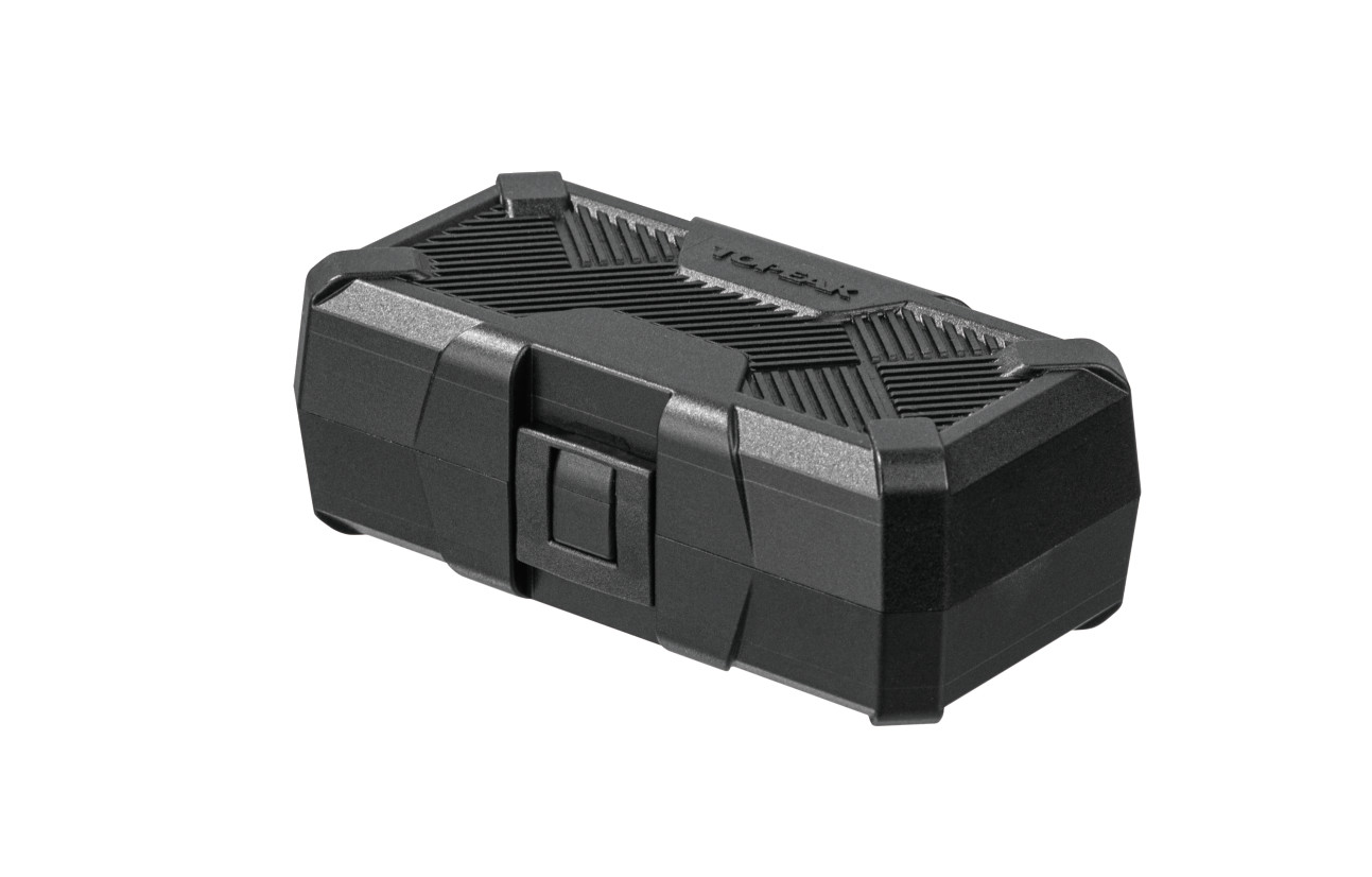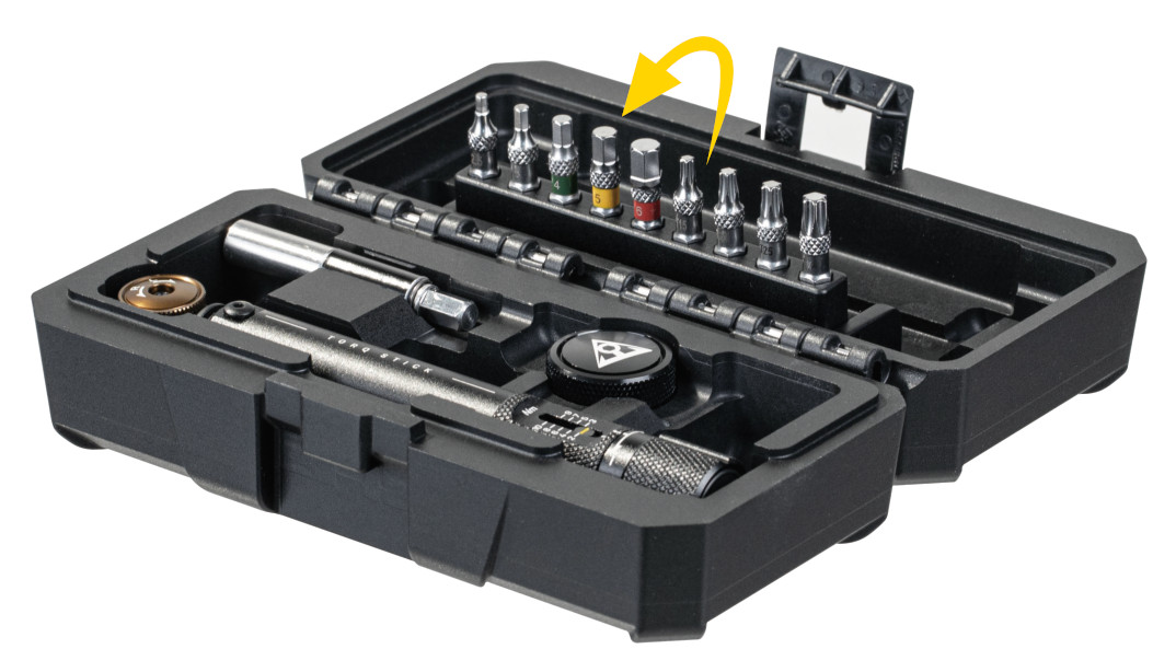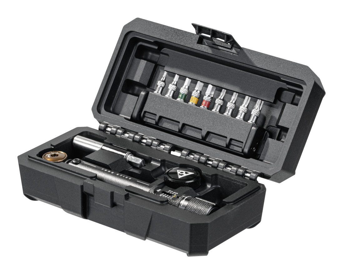In der Topeak Torq Stich Pro Werkzeugbox findest du den passenden Schlüssel. Der hochwertige Drehmomentschlüssel lässt sich individuell in 0.5 Nm Schritten auf das passende Drehmoment zwischen 2 und 10 Nm voreinstellen. Der Torq-Stick ist mit einem umschaltbaren Ratschenkopf mit Standard-Sechskantantrieb ausgestattet. Für kniffeligen Fällen an schlecht zugänglichen Stellen leistet dir der Finger-Bit Holder gute Dienste. Der magnetische Aufsatz hält die Bits sicher an Ort und Stelle. Das Werkzeug findet in der stabilen Werkzeugbox seinen richtigen Platz.