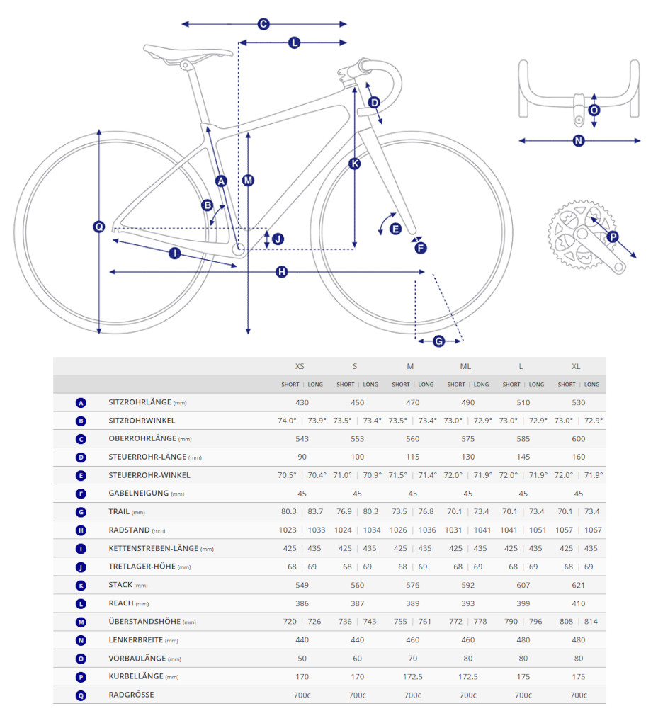 - Kurbel: SRAM Rival D1 DUB, 40 Zähne XS:170mm, S:170mm, M:172.5mm, M/L:172.5mm, L:175mm, XL:175m