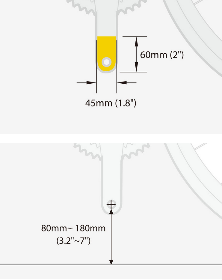 - Passend für Velos mit einem Abstand von 80-180 mm zwischen Kurbel und Boden