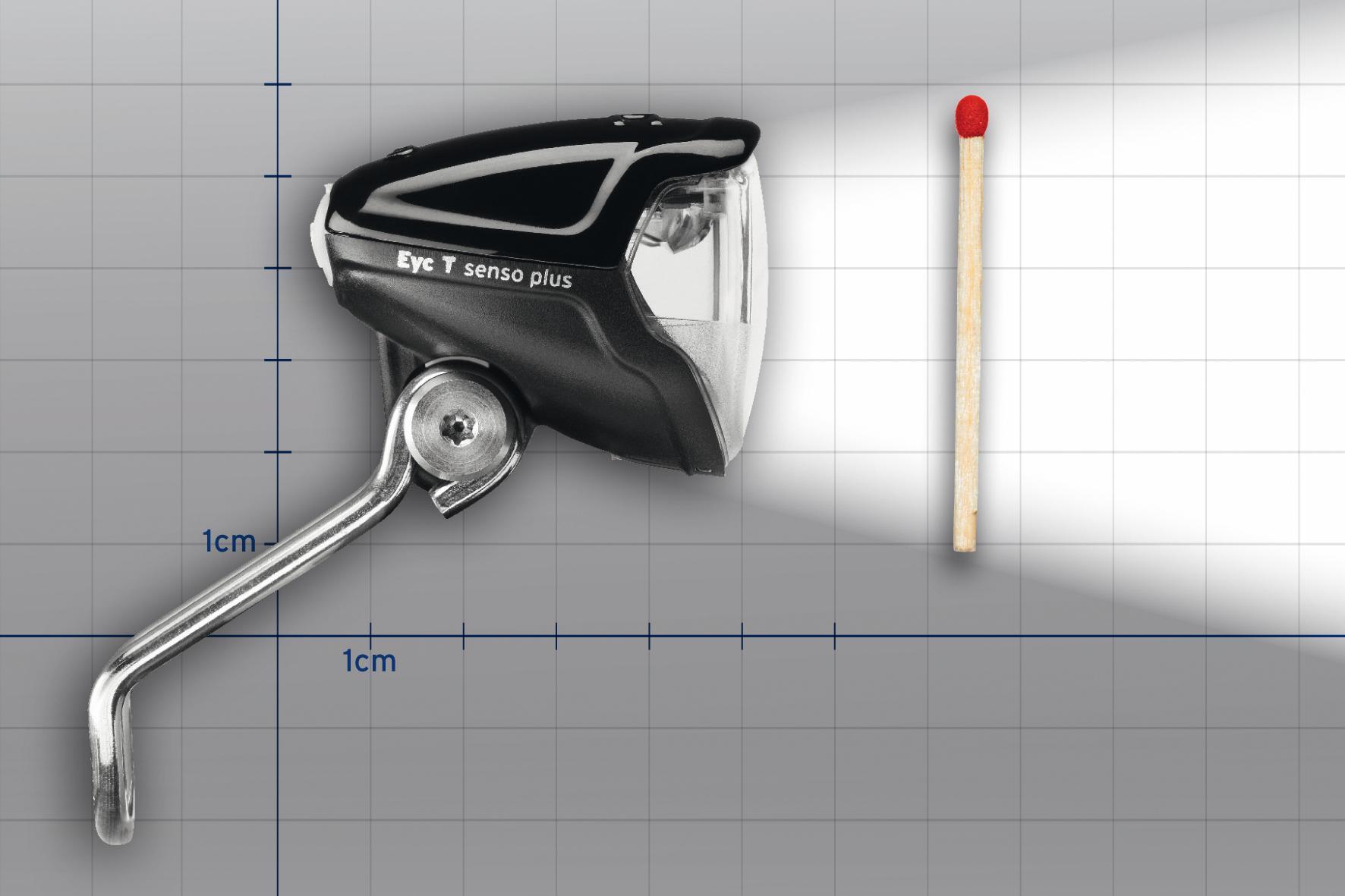 Le feu avant Lumotec EYC N Plus séduit par son éclairement 50 lux, son réflecteur à clipser et son feu de position alimenté par condensateur. Ce feu de la taille d'une boîte d'allumettes est aussi équipé d'un éclairage du champ proche pour une sécurité optimale.