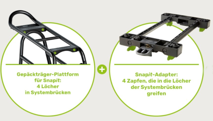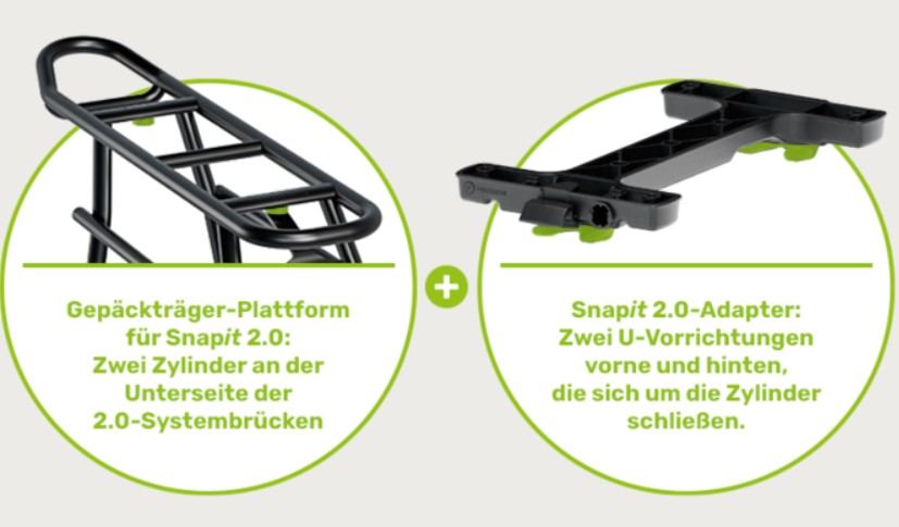 Mit dem Racktime SnapIT System lassen sich Gepäckstücke mit minimalem Aufwand in den Gepäckträger einklicken und wieder lösen. Das Gepäck sitzt komplett fest, ohne zu rutschen oder zu ruckeln. Voraussetzung sind Körbe oder Taschen, die mit dem Racktime SnapIT Adapter ausgestattet sind, und ein Racktime SnapIT Gepäckträger. Racktime SnapIT 2.0 ist die Weiterentwicklung des erfolgreichen Systems.